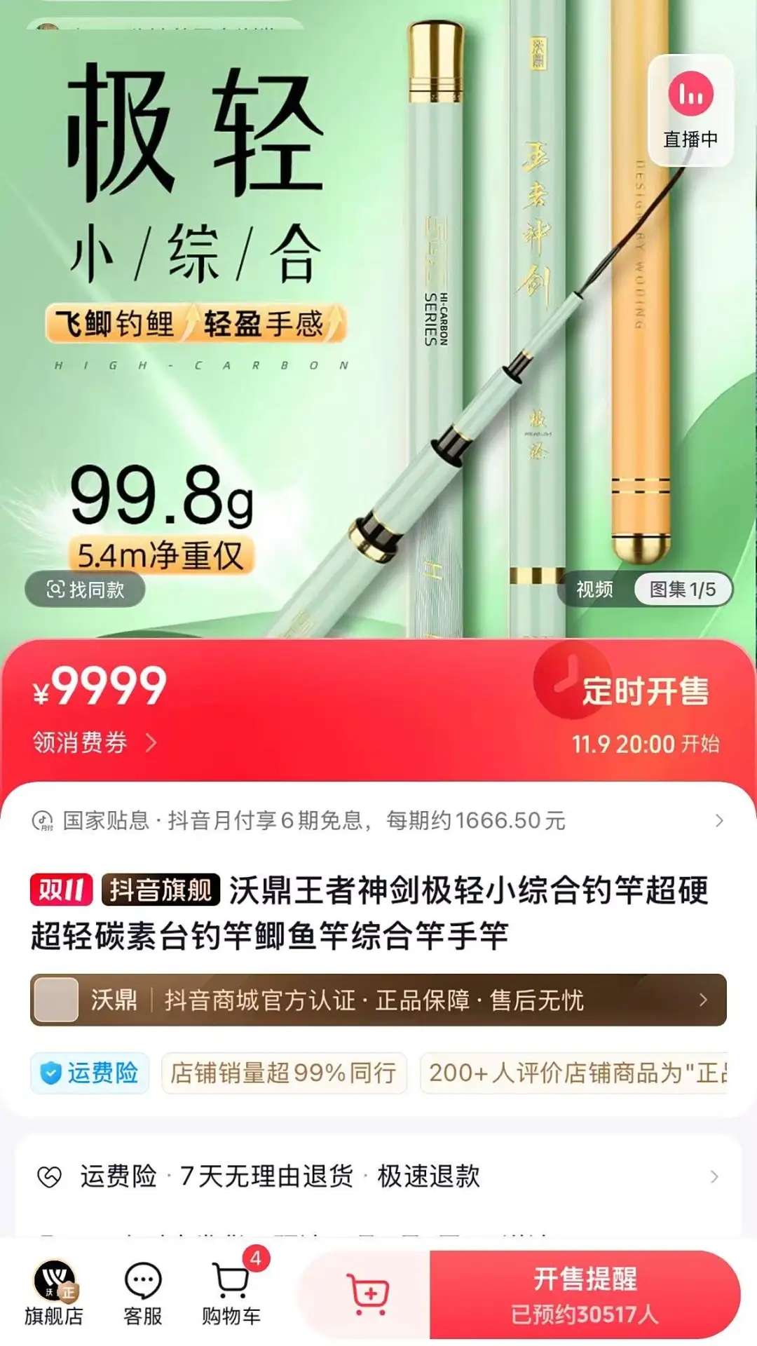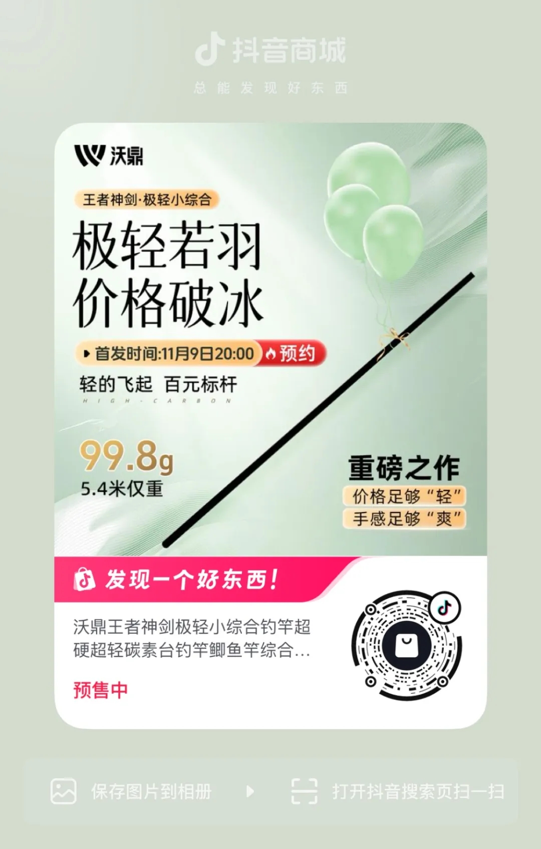 hello钓友们 得益于大家对沃鼎的支持与信赖 以及新品在“四大饿人”友谊赛中的精彩表现 沃鼎即将于11月9日20:00首发的 王者神剑极轻小综合 抖音已经超过30517人提前预约啦! 相信有很多没有看到直播的钓友 一定很好奇这款竿子到底有何种魅力 让三万多个钓友念念不忘 纷纷选择提前预约蹲抢 本期内容 小编就为大家奉上 王者神剑极轻小综合3.6m实钓 再现这款“百元标杆”的优异性能~ 视频中所用的竿子均为 王者神剑极轻小综合3.6m 作钓水域为沃鼎山庄水库 鱼种覆盖鲫鱼、鲤鱼、鳊鱼、翘嘴等 28调性配合强韧的竿身设计 能够满足多种鱼情的作钓需求 视频中可见 王者神剑极轻小综合的 小锥度细竿身设计 在中鱼时 能提供更为细腻的手感和清晰的力量传递 达到刺鱼迅猛、轻松遛鱼的效果 小鱼单手即可操控 手感非常不错 竿子的轻量化设计 非常适用于需要频繁抛投的场景 无论是日常野钓还是竞技赛场 都能在提供良好性能和手感的同时 做到久钓不累、稳定输出 速钓鲫鲤、渔获满满~ 值得一提的是 即便面对吃口猛且稍大个体的翘嘴 王者神剑极轻小综合 也能凭借出色的强度、回弹、韧性和腰力 抗住翘嘴的发力挣扎 在面对巨大冲击时 竿身弧度依旧流畅饱满 不断竿、不切线 稳稳拿下五六十公分的大翘嘴 怎么样钓友们 看过王者神剑极轻小综合实钓以后 是不是按捺不住想立马入手了呢 11月9日晚20:00全网首发 记得提前预约锁定惊喜 这款性价比拉满的极轻小综合竿 究竟会带来怎样的惊艳体验? 一起期待吧!