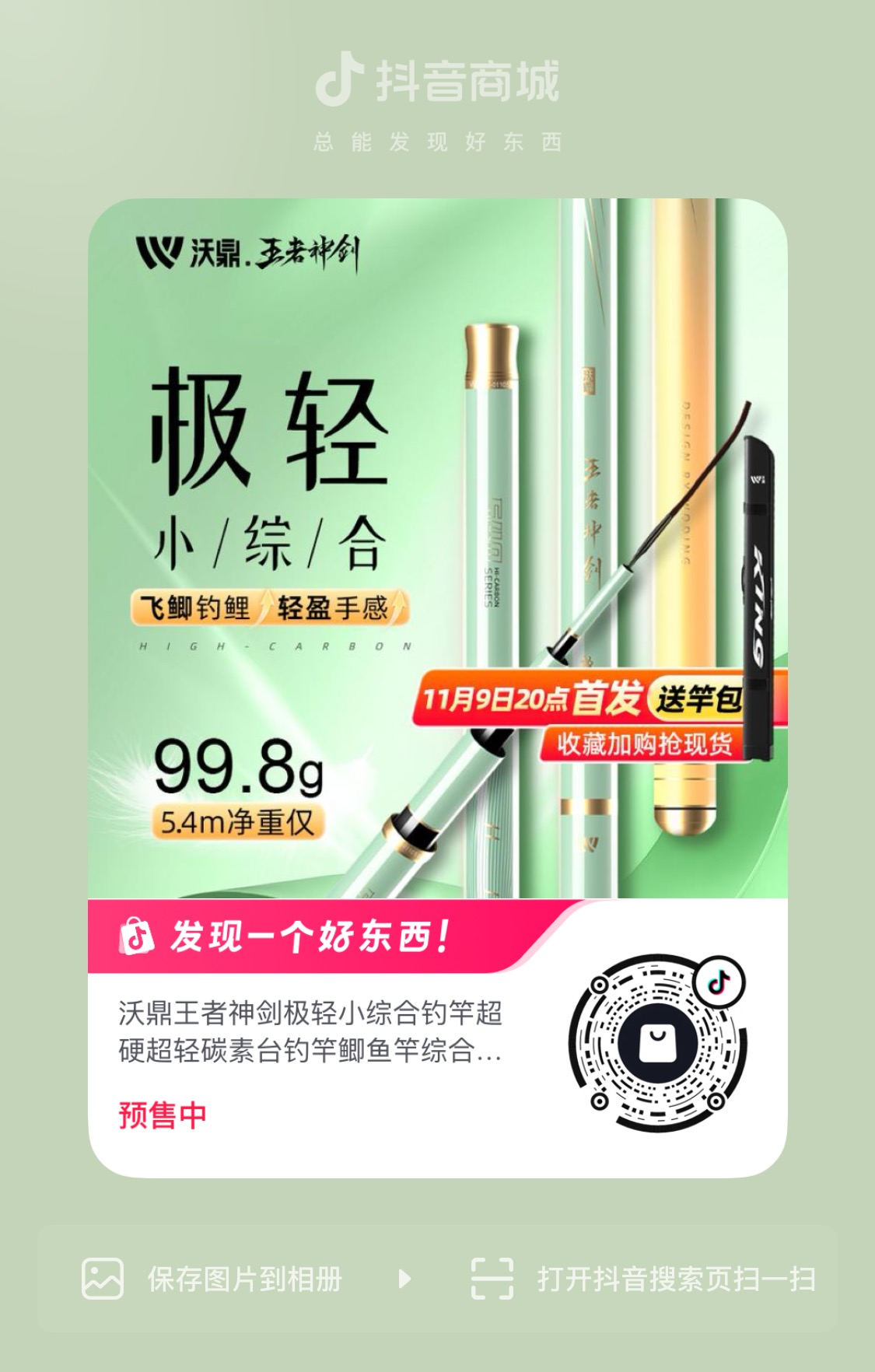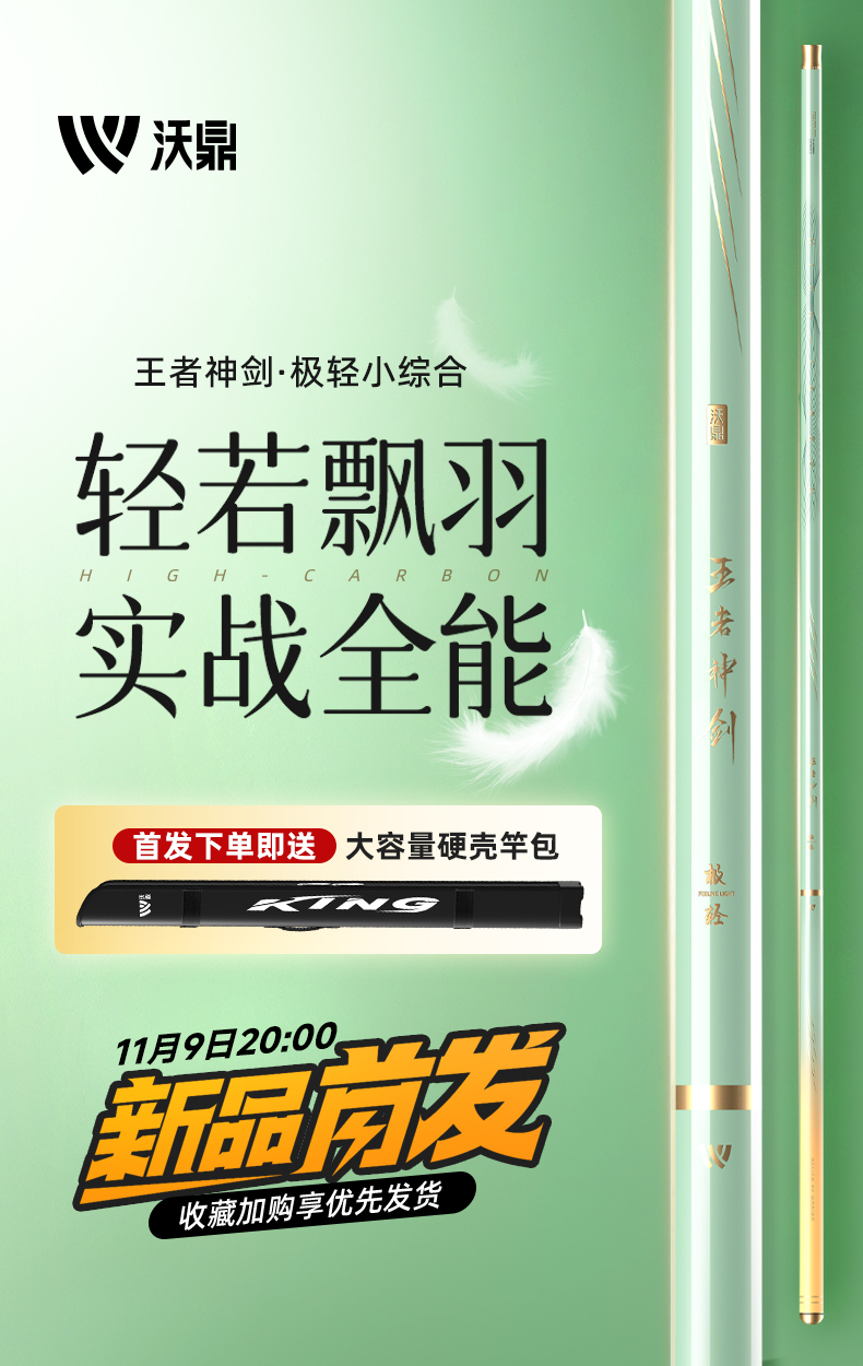 hello钓友们 【王者神剑极轻小综合】 今晚20:00 各大平台沃鼎官方店铺 全网同步首发 知道你们一直想了解 这款竿子的全尺寸参数 首发之际 小编为大家奉上新品详情页及首发福利 速来一起了解一下吧~ 王者神剑极轻小综合 首发福利 首发期间 购买【王者神剑极轻小综合】 即有大容量硬壳竿包相送 数量有限 先到先得! 11月9日(今晚)首发当天 抖音【沃鼎官方旗舰店】 直播间福袋不间断随机发放 除此之外还有 双11活动期间buff疯狂叠加 钓箱、钓伞、探索竿包 统统满额即赠 错过简直要拍大腿! 【王者神剑极轻小综合】 轻“竿”上阵 速钓鲫鲤 有它就够啦! 今晚20:00全网首发 钓友们记得提前预约蹲守哦~