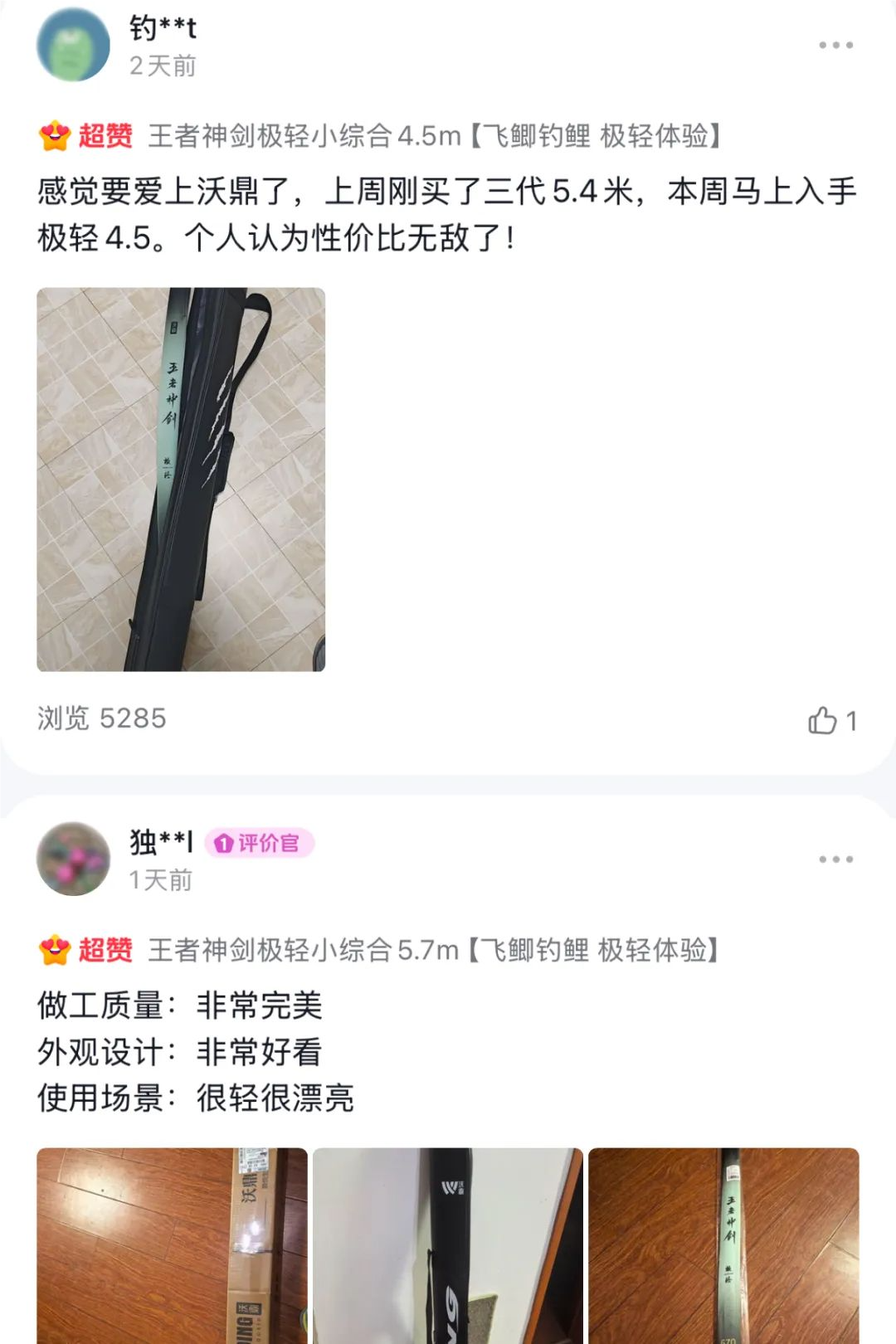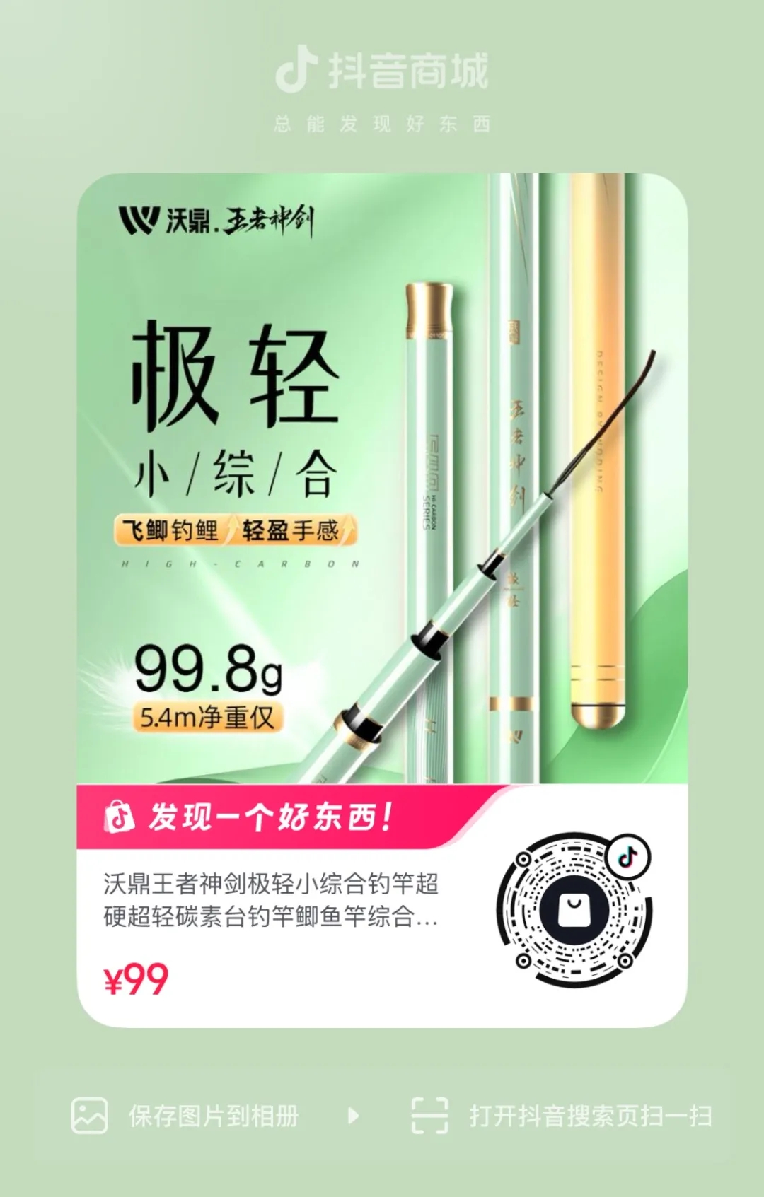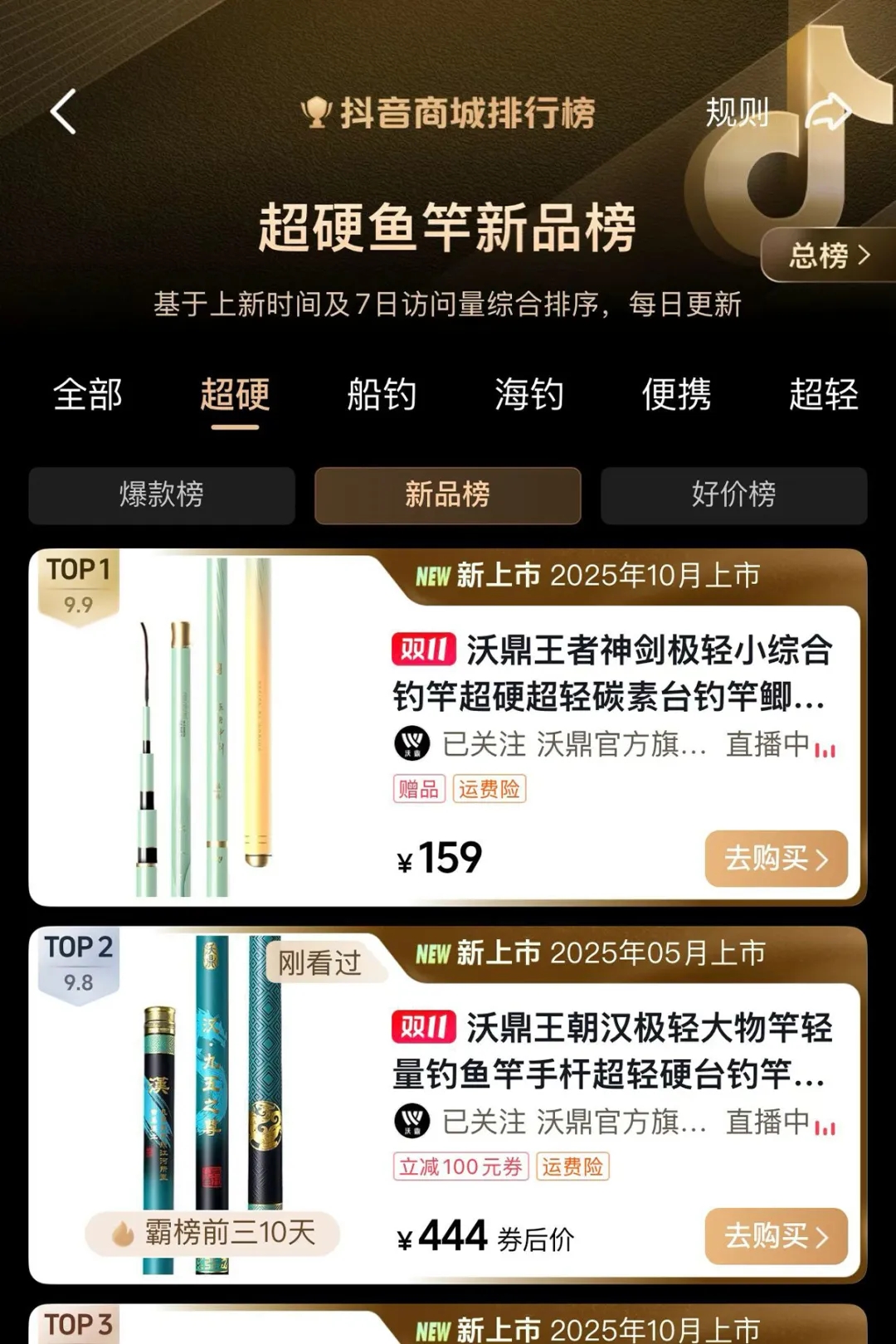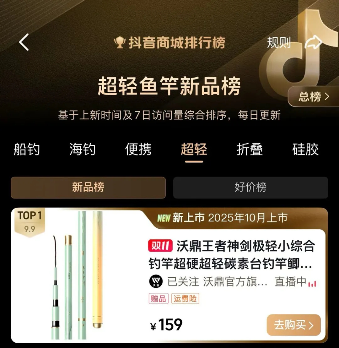 hello钓友们 给大家汇报一份火热战报! 沃鼎11月9日首发的新品 【王者神剑极轻小综合】 利刃出鞘,首发即爆单! 11月9日-11日 🔥首发3天全平台销量突破1.4万支🔥 工厂全线火力全开 仍难追上各位钓友下单的手速! 为不让热爱久待 我们现已紧急开启预售模式~ 首发即爆 打破纪录 11月9日20:00首发后 抖音沃鼎官方旗舰店 10分钟爆卖近2000支 首发当天20:00-24:00 🔥仅抖音平台销量便突破6000支🔥 直接刷沃鼎新品纪录! 占据榜单 领跑排行 如此人气与销量 分分钟占据平台榜单 首发第二天荣登抖音商城排行榜 “ 超硬鱼竿新品榜TOP1” 与沃鼎今年上半年首发的 王朝系列汉极轻大物竿并驾齐驱 🔥占据榜单前两名🔥 强势登顶! 同日拿下抖音商城排行榜 “ 超硬鱼竿新品榜TOP1” 这波热度有多强 看榜单就知道了 懂的都懂! 在天猫平台 首发至今更是跻身钓竿类三大榜单前三 荣登天猫榜单 “ 垂钓钓竿新品榜TOP1” “ 垂钓钓竿热销榜TOP2” “ 碳素钓竿热销榜TOP3” 🔥与同系列的三代综合竿一同霸榜!🔥 沃鼎产品的人气与热度居高不下 可见产品质量与性能都是很能打的! 钓友反馈 好评出圈 首发人气高、销量好还不够 我们深知钓友们都想尽快收到心爱的竿子 因此只要有现货就马不停蹄地发走 截至今天已经有不少钓友收到了竿子 并且进行了下水试钓 小编为还没入手的钓友整理了一波 新品开箱反馈 速来看看大家的评价吧~ 通过一系列的返图和评价 不难看出已经入手的钓友们 对新品的评价还是非常高的 大家纷纷反馈新品 手感轻好抛投、颜值高、腰力很不错 打频也不累 性价比拉满! 王者神剑极轻小综合 人气高、销量好、好评出圈 首发后市场反响热烈 🔥现火爆预售中🔥 下单更有沃鼎品牌缠把带相送 感兴趣的钓友们速来选购! 这个冬天出钓带上它就对啦~