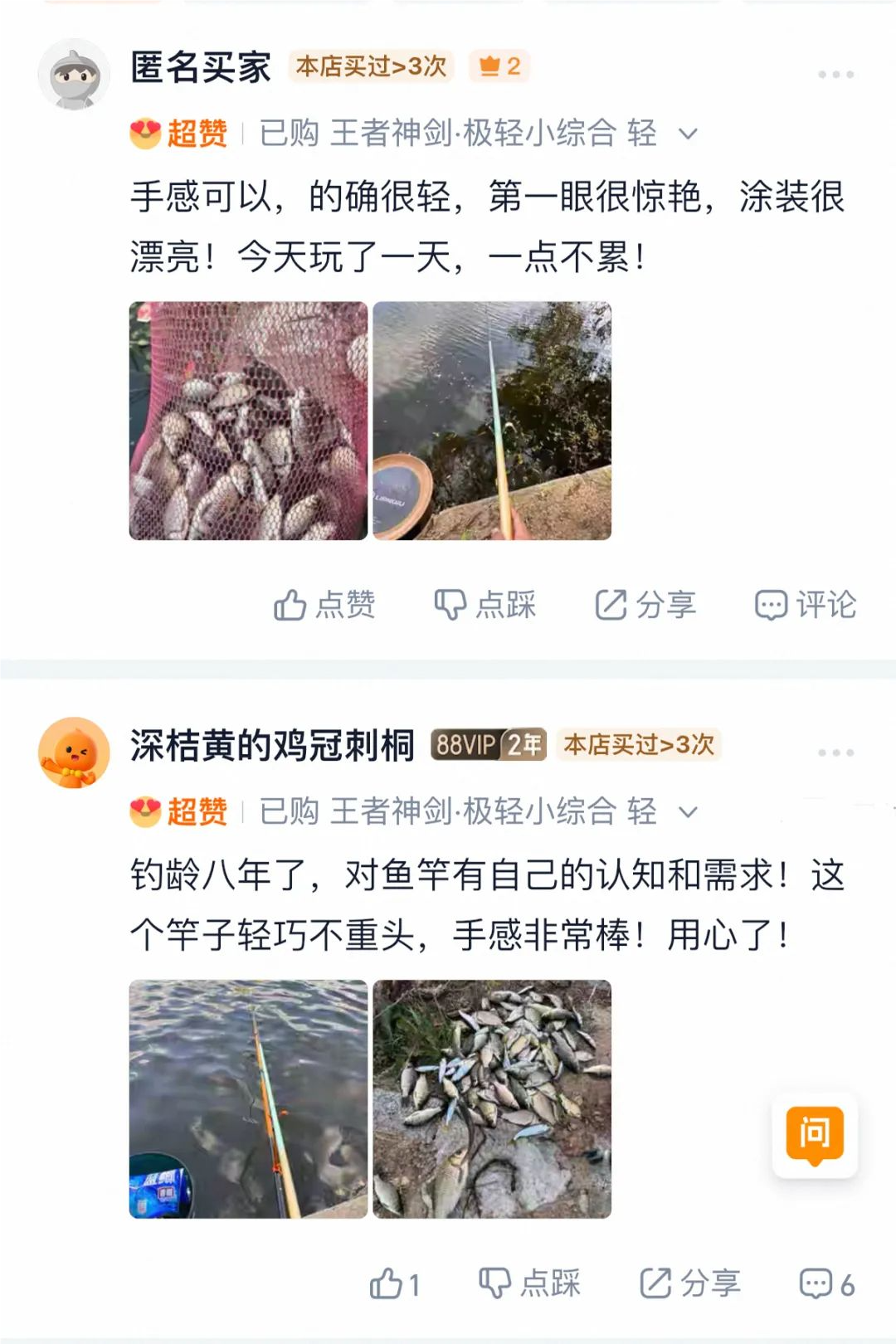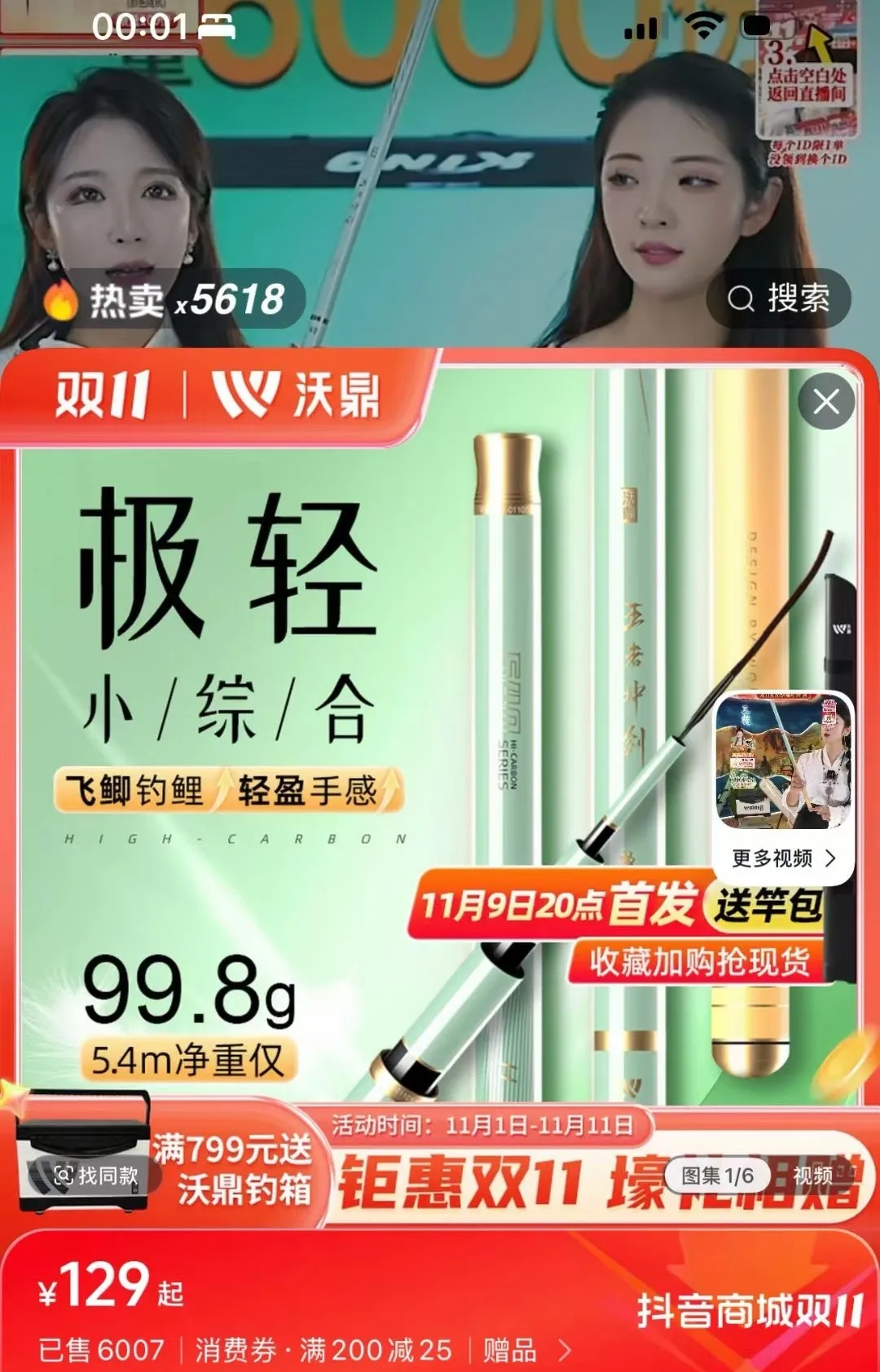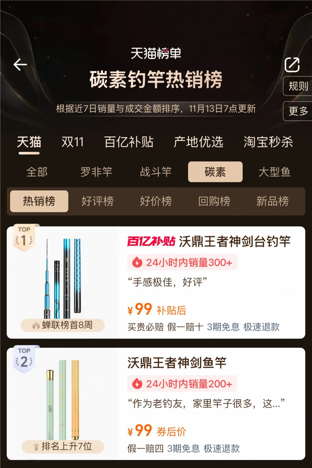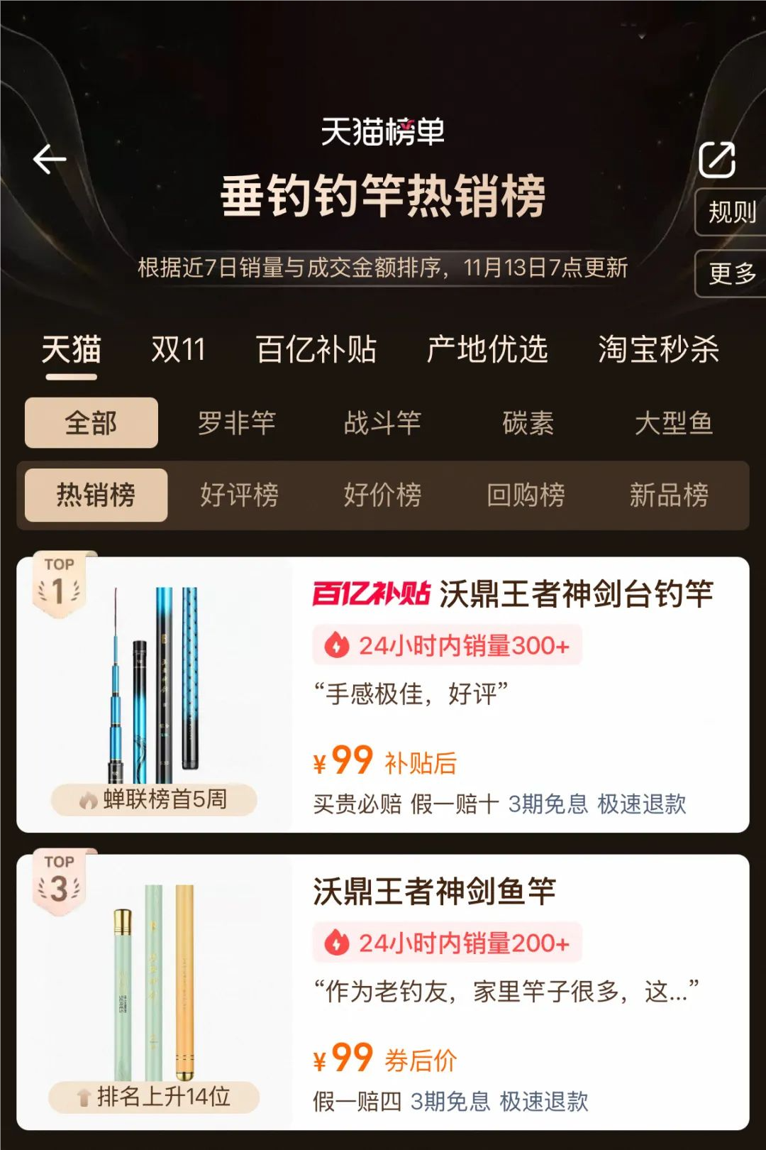 hello钓友们 给大家汇报一份火热战报! 沃鼎11月9日首发的新品 【王者神剑极轻小综合】 利刃出鞘,首发即爆单! 11月9日-11日 🔥首发3天全平台销量突破1.4万支🔥 工厂全线火力全开 仍难追上各位钓友下单的手速! 为不让热爱久待 我们现已紧急开启预售模式~ 首发即爆 打破纪录 11月9日20:00首发后 抖音沃鼎官方旗舰店 10分钟爆卖近2000支 首发当天20:00-24:00 🔥仅抖音平台销量便突破6000支🔥 直接刷沃鼎新品纪录! 占据榜单 领跑排行 如此人气与销量 分分钟占据平台榜单 首发第二天荣登抖音商城排行榜 “ 超硬鱼竿新品榜TOP1” 与沃鼎今年上半年首发的 王朝系列汉极轻大物竿并驾齐驱 🔥占据榜单前两名🔥 强势登顶! 同日拿下抖音商城排行榜 “ 超硬鱼竿新品榜TOP1” 这波热度有多强 看榜单就知道了 懂的都懂! 在天猫平台 首发至今更是跻身钓竿类三大榜单前三 荣登天猫榜单 “ 垂钓钓竿新品榜TOP1” “ 垂钓钓竿热销榜TOP2” “ 碳素钓竿热销榜TOP3” 🔥与同系列的三代综合竿一同霸榜!🔥 沃鼎产品的人气与热度居高不下 可见产品质量与性能都是很能打的! 钓友反馈 好评出圈 首发人气高、销量好还不够 我们深知钓友们都想尽快收到心爱的竿子 因此只要有现货就马不停蹄地发走 截至今天已经有不少钓友收到了竿子 并且进行了下水试钓 小编为还没入手的钓友整理了一波 新品开箱反馈 速来看看大家的评价吧~ 通过一系列的返图和评价 不难看出已经入手的钓友们 对新品的评价还是非常高的 大家纷纷反馈新品 手感轻好抛投、颜值高、腰力很不错 打频也不累 性价比拉满! 王者神剑极轻小综合 人气高、销量好、好评出圈 首发后市场反响热烈 🔥现火爆预售中🔥 下单更有沃鼎品牌缠把带相送 感兴趣的钓友们速来选购! 这个冬天出钓带上它就对啦~