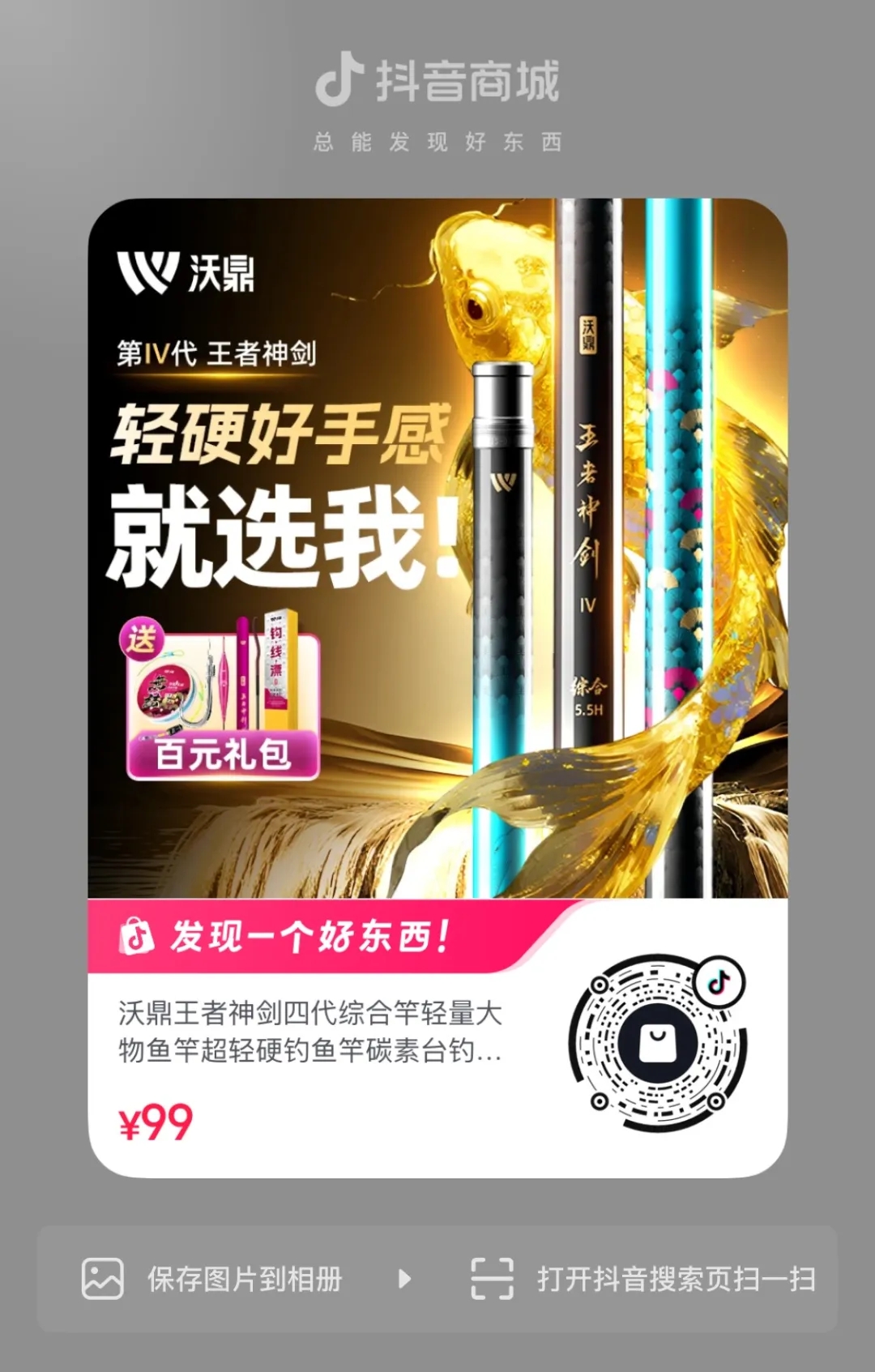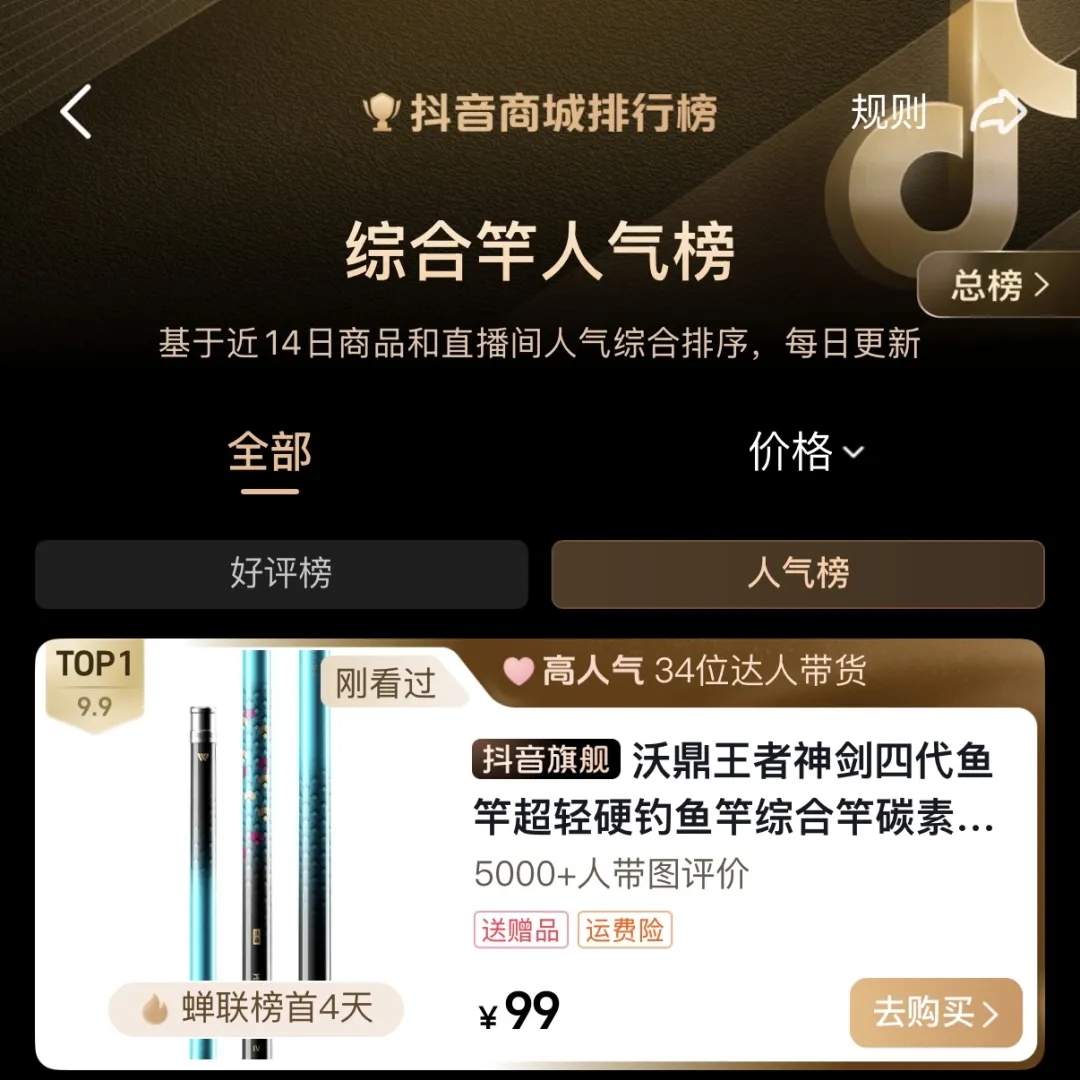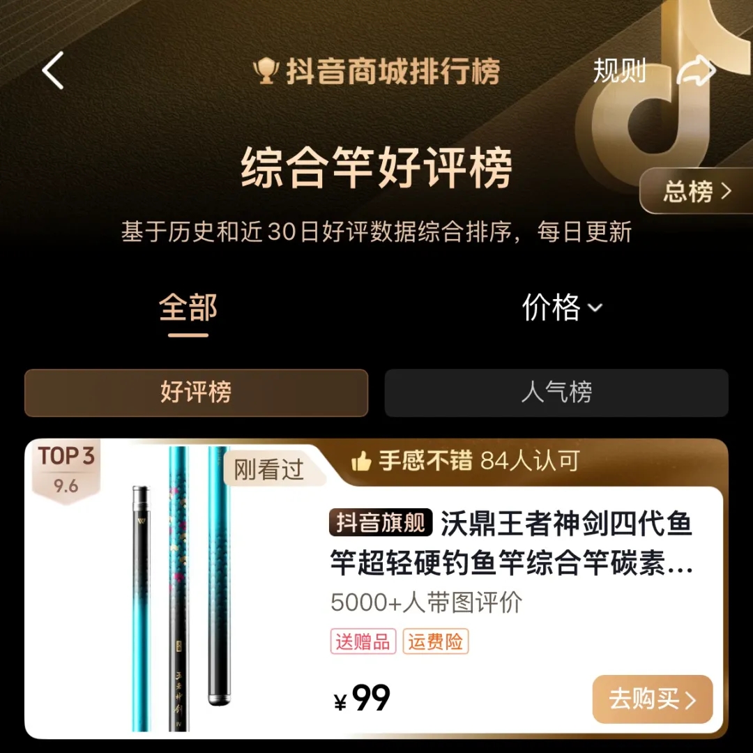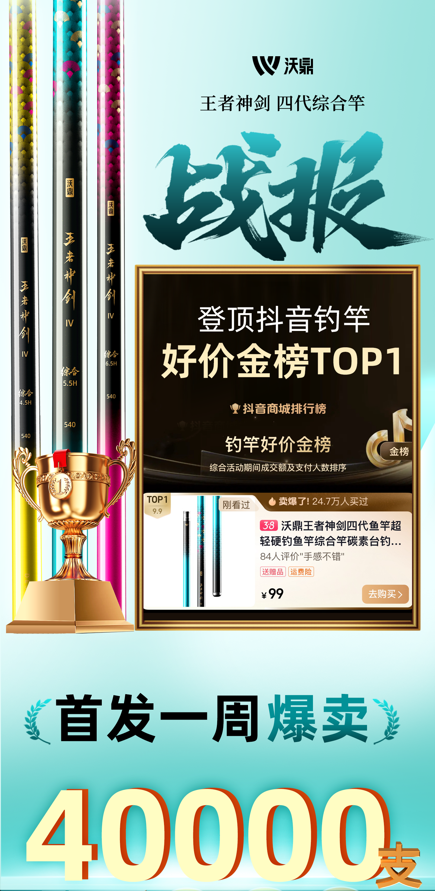 hello钓友们 3月6日上午10:00 沃鼎在天津春展上正式发布了 备受期待的王者神剑四代综合竿 首发当天就创造了销量突破12000支的佳绩 截至目前,首发仅一周 新品的销量依旧一路狂飙 全网累计畅销40000支! 本期内容 小编就带大家回顾一下这波“首发战绩” 看看钓友们为什么都选择了它~ 沃鼎王者神剑四代综合竿 首发即领跑,霸榜双平台! 不仅销量势如破竹 更强势登顶 🏆 荣登【抖音商城排行榜】🏆 综合竿人气榜TOP1 蝉联榜首4天 首发以来热度不减 人气居高不下 100元以下综合竿爆款榜TOP1 蝉联榜首5天 用实力证明 好竿也能不贵 性价比才是王道! 综合竿好评榜TOP3 口碑与销量齐飞 热度与品质并存 🏆 荣登【天猫榜单】🏆 鱼竿热销榜 鱼竿热销榜TOP1 台钓竿鱼竿热销榜TOP1 江河鱼竿热销榜TOP1 湖泊鱼竿热销榜TOP1 淡水鱼竿热销榜TOP1 硬调鱼竿热销榜TOP1 六大榜首,六天蝉联 沃鼎王者神剑四代综合竿 一周内领跑两大平台的九大榜单 可见钓友们对沃鼎产品的高度认可 一周以来 首批下水实钓反馈已刷屏归来 接下来小编为钓友们奉上 来自全国钓友的渔获秀 一起沉浸式感受 沃鼎王者神剑四代综合竿的非凡实力! 钓友们纷纷反馈 沃鼎王者神剑四代综合竿 轻、挺、稳、做工好 轻量设计、腰力足又抗造 颜值实力双在线 无数钓友给出了五星好评 并且表示 野钓再也不用频繁换竿了~ 很多入手王者神剑四代综合竿的钓友 性能、颜值、性价比 也都没有让大家失望! 还在观望的钓友们,别再犹豫! 让它随你一同征战未知水域吧!