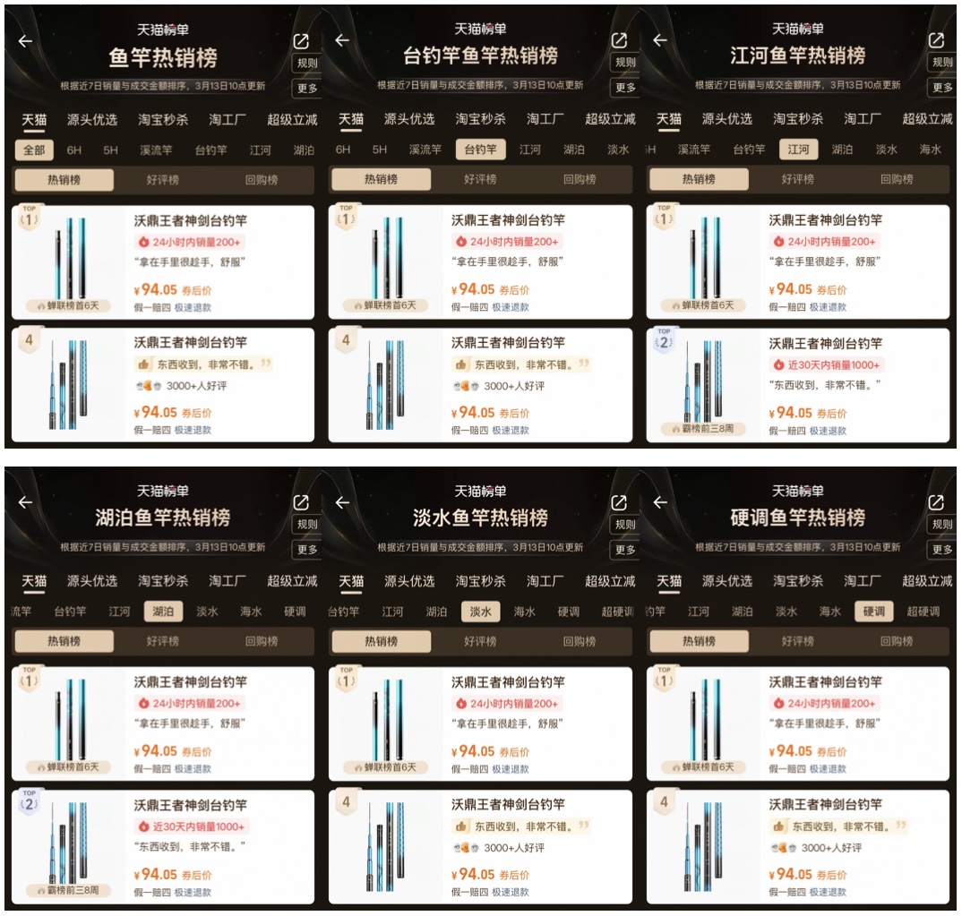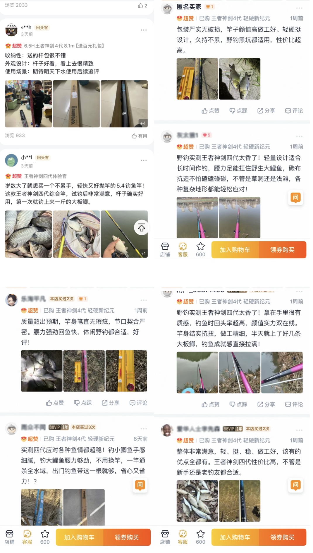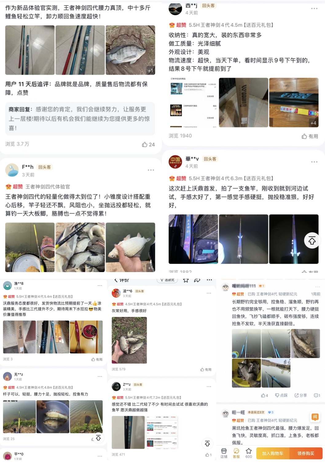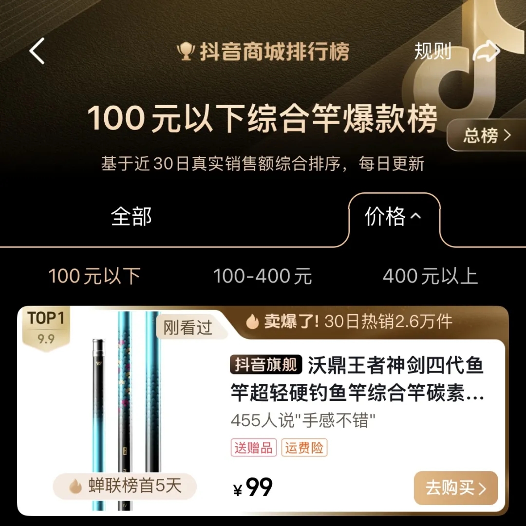 hello钓友们 3月6日上午10:00 沃鼎在天津春展上正式发布了 备受期待的王者神剑四代综合竿 首发当天就创造了销量突破12000支的佳绩 截至目前,首发仅一周 新品的销量依旧一路狂飙 全网累计畅销40000支! 本期内容 小编就带大家回顾一下这波“首发战绩” 看看钓友们为什么都选择了它~ 沃鼎王者神剑四代综合竿 首发即领跑,霸榜双平台! 不仅销量势如破竹 更强势登顶 🏆 荣登【抖音商城排行榜】🏆 综合竿人气榜TOP1 蝉联榜首4天 首发以来热度不减 人气居高不下 100元以下综合竿爆款榜TOP1 蝉联榜首5天 用实力证明 好竿也能不贵 性价比才是王道! 综合竿好评榜TOP3 口碑与销量齐飞 热度与品质并存 🏆 荣登【天猫榜单】🏆 鱼竿热销榜 鱼竿热销榜TOP1 台钓竿鱼竿热销榜TOP1 江河鱼竿热销榜TOP1 湖泊鱼竿热销榜TOP1 淡水鱼竿热销榜TOP1 硬调鱼竿热销榜TOP1 六大榜首,六天蝉联 沃鼎王者神剑四代综合竿 一周内领跑两大平台的九大榜单 可见钓友们对沃鼎产品的高度认可 一周以来 首批下水实钓反馈已刷屏归来 接下来小编为钓友们奉上 来自全国钓友的渔获秀 一起沉浸式感受 沃鼎王者神剑四代综合竿的非凡实力! 钓友们纷纷反馈 沃鼎王者神剑四代综合竿 轻、挺、稳、做工好 轻量设计、腰力足又抗造 颜值实力双在线 无数钓友给出了五星好评 并且表示 野钓再也不用频繁换竿了~ 很多入手王者神剑四代综合竿的钓友 性能、颜值、性价比 也都没有让大家失望! 还在观望的钓友们,别再犹豫! 让它随你一同征战未知水域吧!